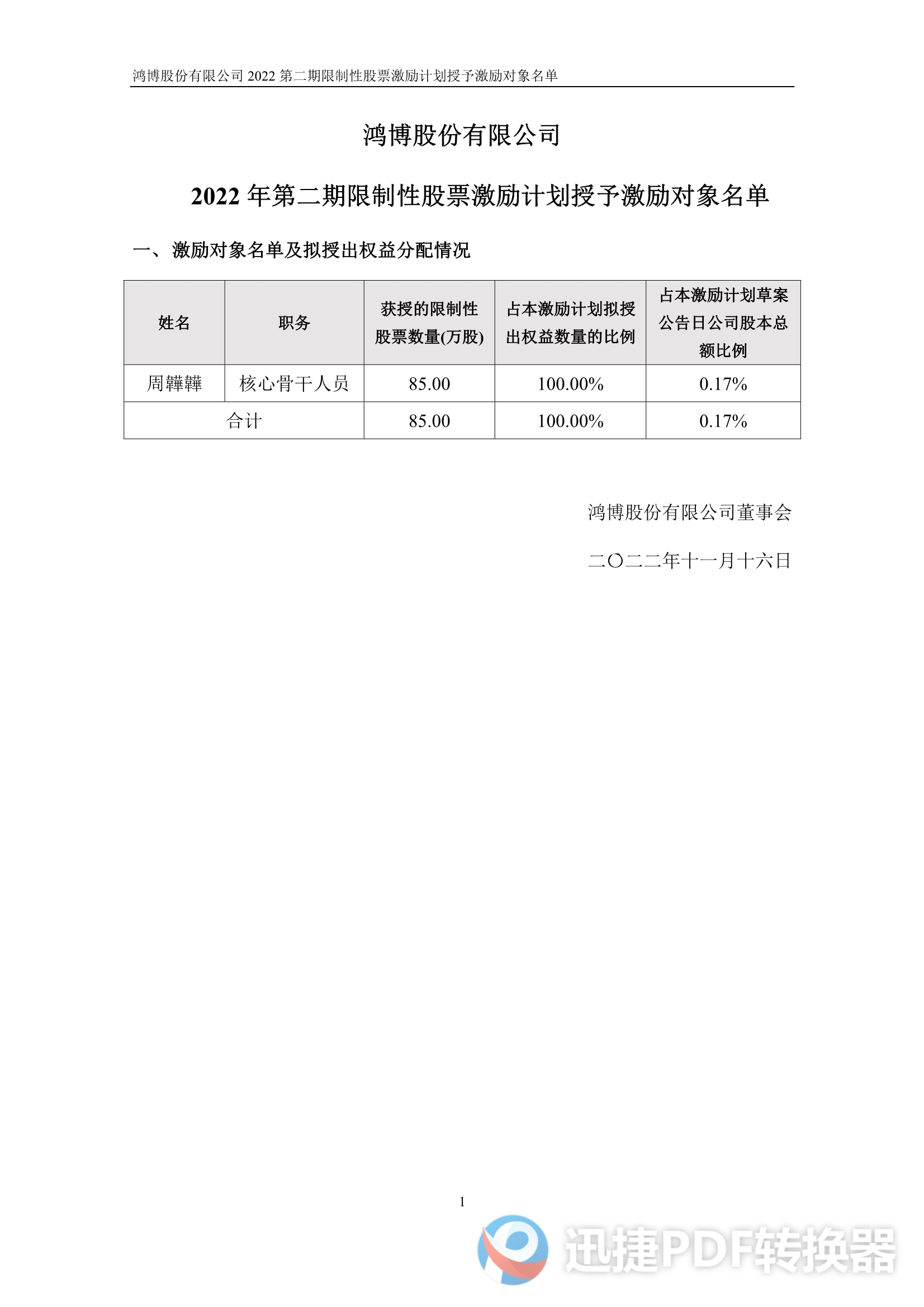 鸿博股份2022年第二期限制性股票激励计划授予激励对象名单